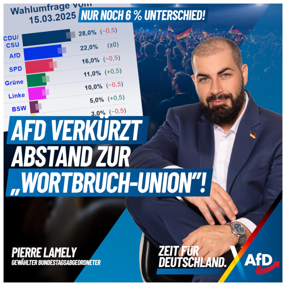 Die AfD klettert in den Umfragen weiter nach oben, während die “Schwampel”-Parteien aus CDU, SPD und GrĂĽnen immer weiter abrutschen. Wir haben es im Wahlkampf immer gesagt: Wer Merz und die CDU wählt, bekommt am Ende weiterhin Ampel-Politik!