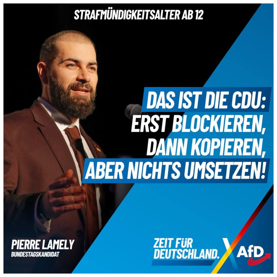 CDU-Sekretär Linnemann sagte: „Ich bin es leid, ständig über das Thema zu sprechen, ohne dass etwas passiert.“ Verlogener geht es kaum: Im Bundestag hatte die AfD einen ausformulierten Gesetzentwurf (Drs: 20/6194) vorgelegt. Und was hat die Union gemacht? Richtig. Sie hat unser „Gesetz zur besseren Bekämpfung von schwerer Kinderkriminalität“ ABGELEHNT. Es hätte also schon längst etwas passieren können, Herr Linnemann – aber Sie und Ihre Partei wollten nicht!