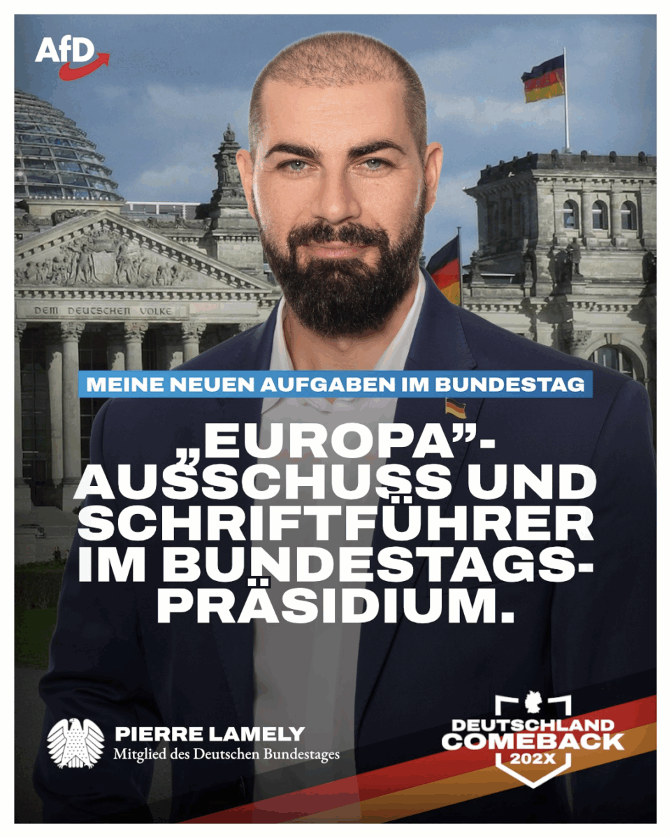 Gestern wurde ich durch die AfD-Bundestagsfraktion als ordentliches Mitglied in den Ausschuss für europäische Angelegenheiten und zum Schriftführer im Bundestagspräsidium gewählt. Danke für das Vertrauen!