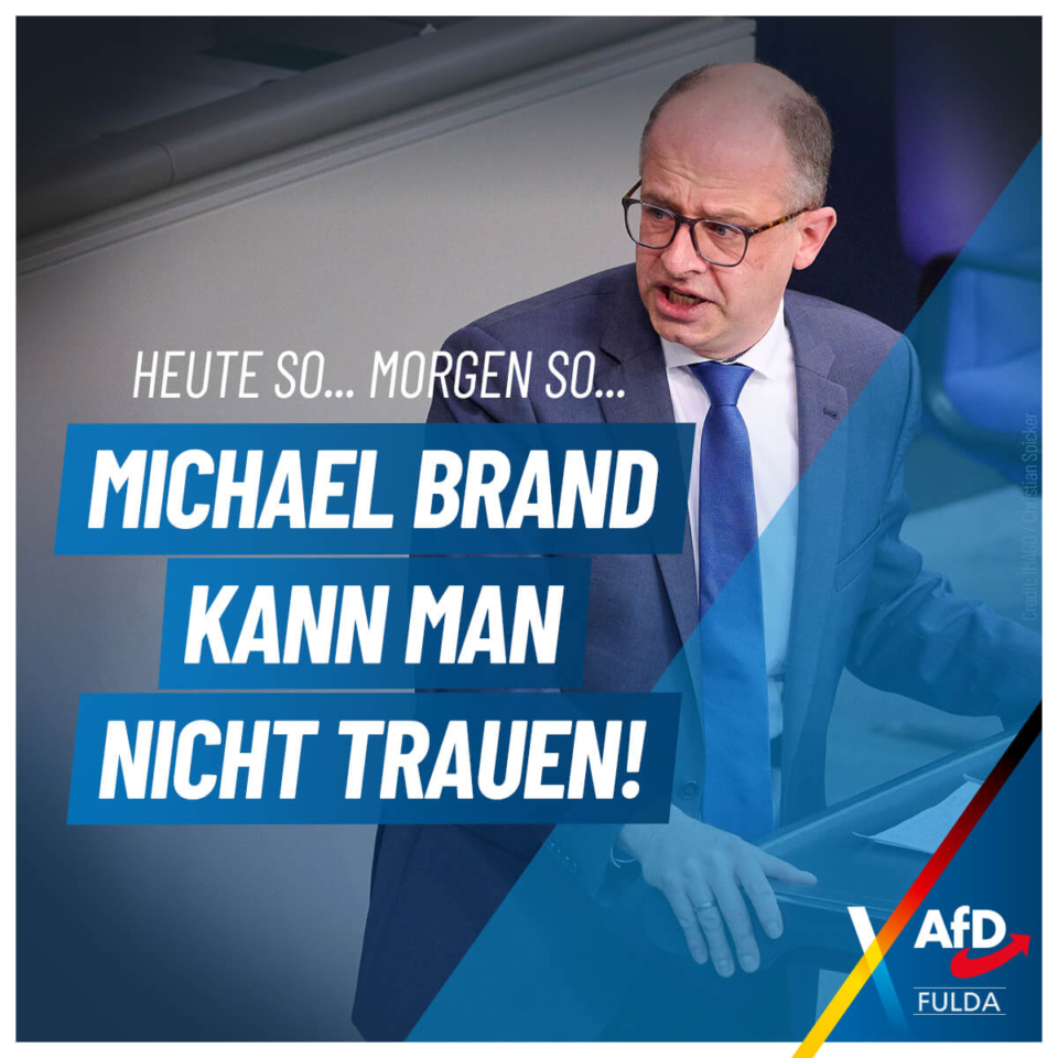 Der Fuldaer CDU Bundestagsabgeordnete Michael Brand stand über 16 Jahre lang treu an der Seite von Angela Merkel, während diese Deutschland in den Abgrund regierte. Migrationskrise, Grenzöffnung und Ansturm der Illegalen, Herrschaft des Unrechts, Atomausstieg, CO2-Steuer, Verbrenner-Aus und vieles mehr – alles herbeigeführt durch die Merkel CDU und stets mitgetragen von Michael Brand.