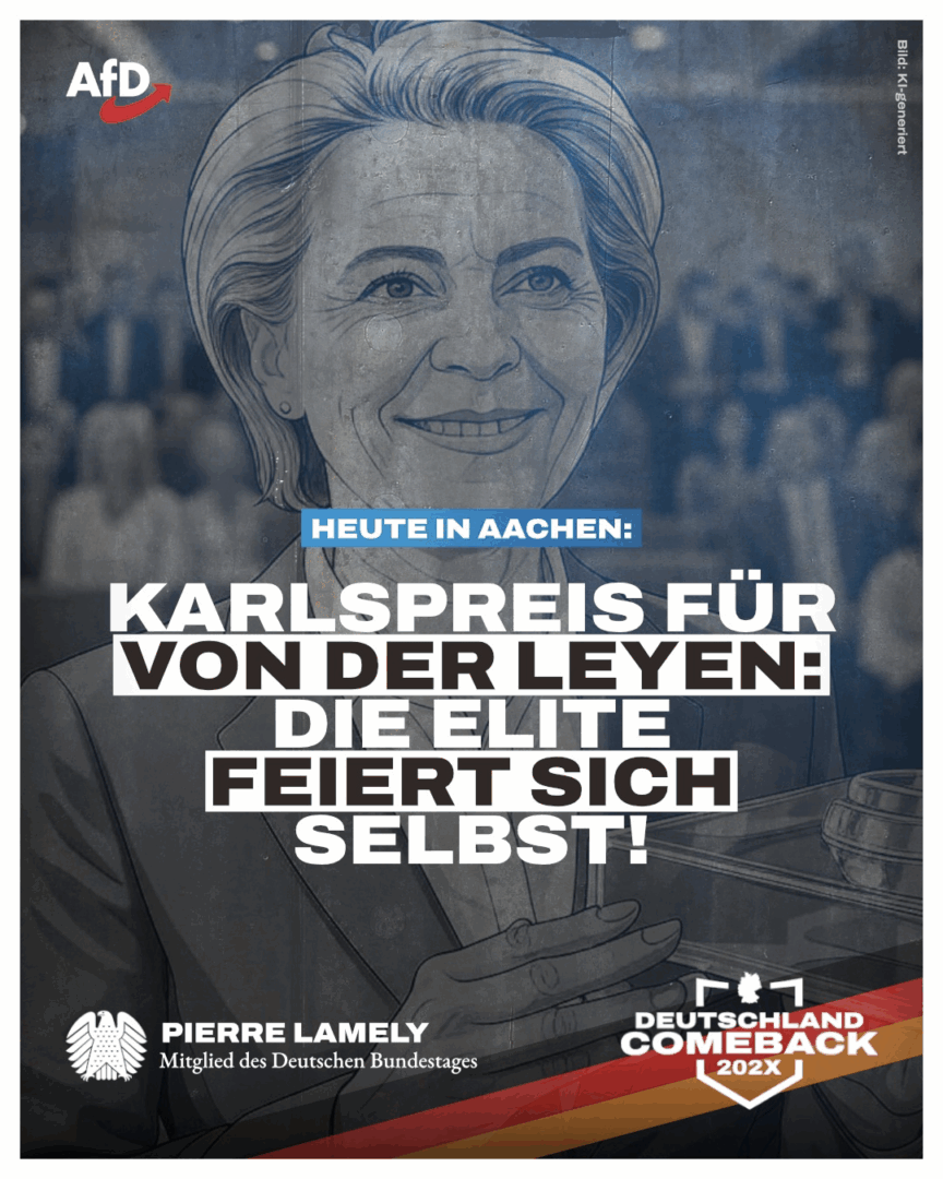 🛑 Schon wieder ein Preis für von der Leyen! Es klingt wie Satire, ist aber bitterer Ernst: Nach dem Karlspreis mit einer Million Euro Preisgeld wird Ursula von der Leyen nun erneut ausgezeichnet – diesmal vom Magazin „Politik & Kommunikation“ als „Politikerin des Jahres“. Die Begründung: Sie sei eine „außergewöhnliche Führungspersönlichkeit“, die Europa „mit Geschick, Entschlossenheit und Weitblick“ durch schwierige Zeiten führe.